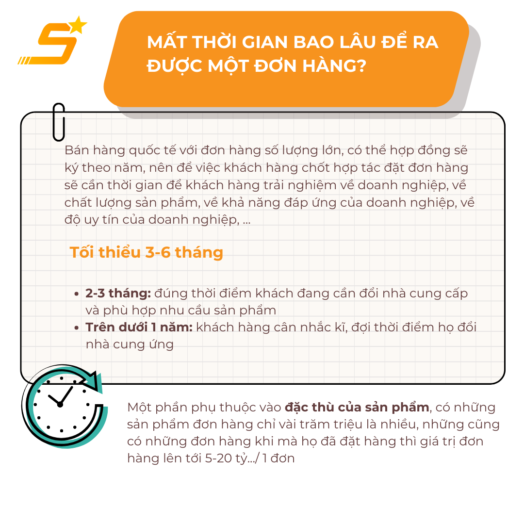 Thời gian để chốt thành công một đơn hàng xuất khẩu quốc tế phụ thuộc vào nhiều yếu tố. Quá trình này có thể kéo dài từ 3 đến 6 tháng nếu thuận lợi. Trong nhiều trường hợp có thể mất hơn 1 năm.